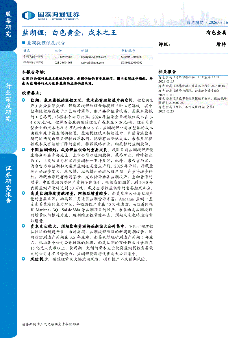 有色金属行业:国泰海通证券-有色金属行业盐湖提锂深度报告:盐湖锂,白色黄金,成本之王-260316
