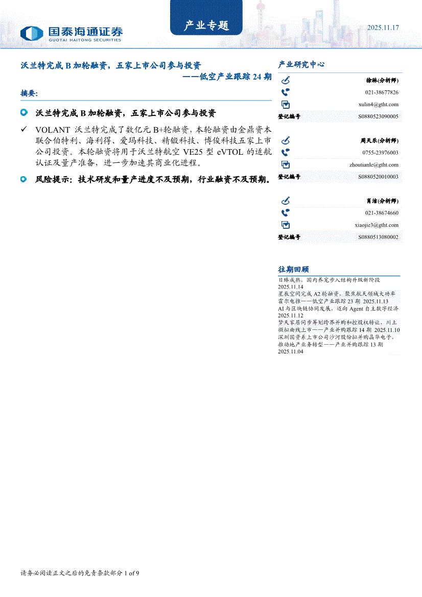 国泰海通证券-低空产业跟踪24期:沃兰特完成B加轮融资,五家上市公司参与投资-251117