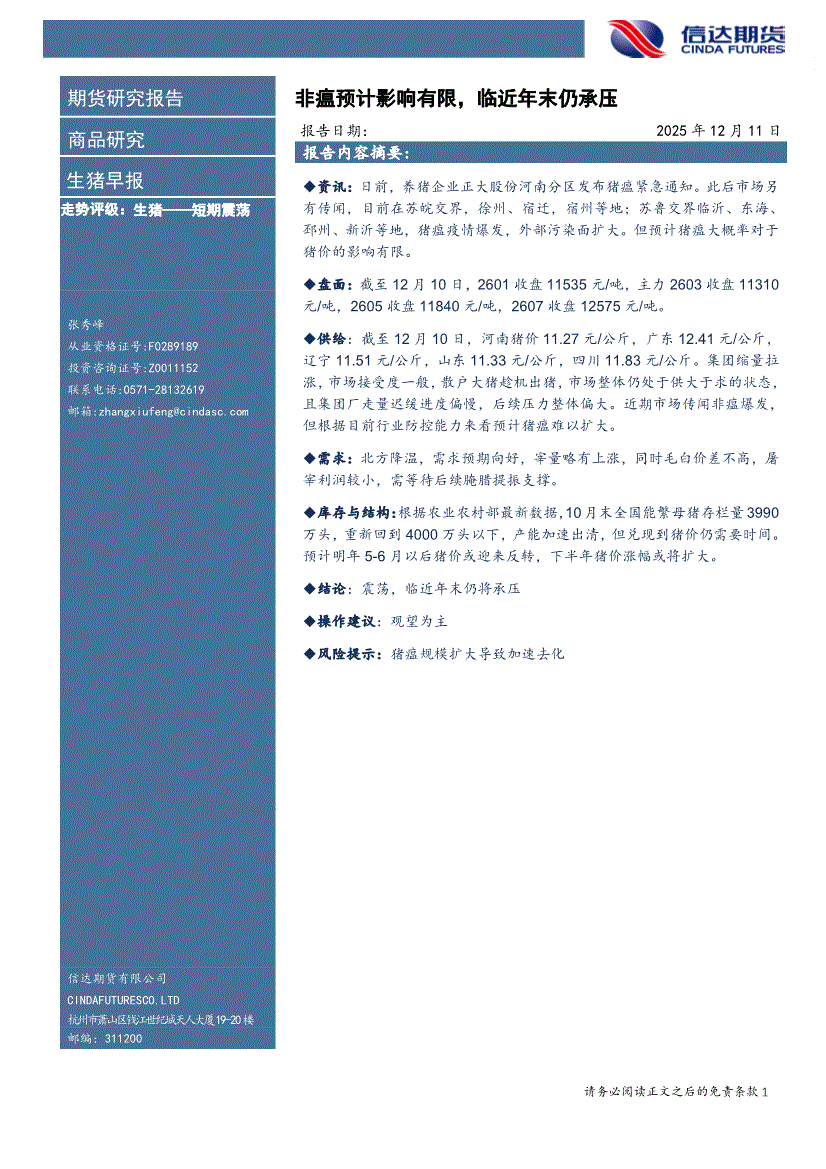 信达期货-生猪早报:非瘟预计影响有限,临近年末仍承压-251211