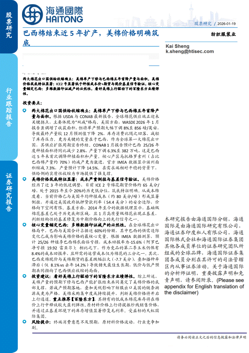 纺织服装行业:海通国际-纺织服装行业:巴西棉结束近5年扩产,美棉价格明确筑底-260119
