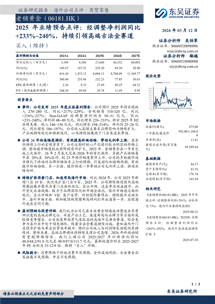老铺黄金:东吴证券-老铺黄金-6181.HK-2025年业绩预告点评:经调整净利润同比+233%~240%,持续引领高端古法金赛道-260312