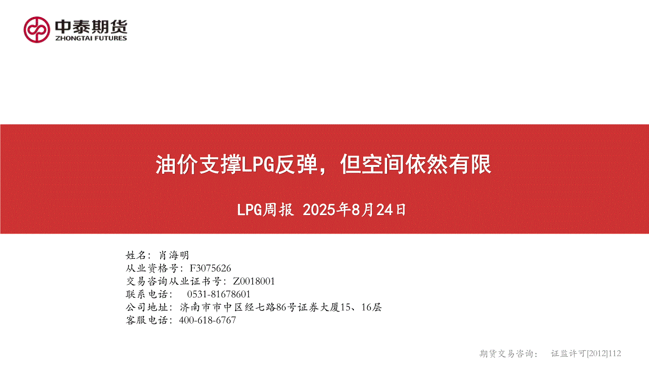 中泰期货-LPG周报:油价支撑LPG反弹,但空间依然有限-250824