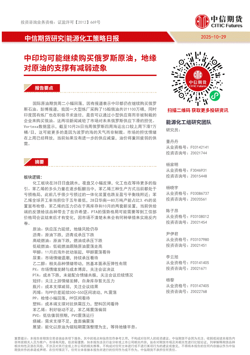 中信期货-能源化工策略日报:中印均可能继续购买俄罗斯原油,地缘对原油的支撑有减弱迹象-251029