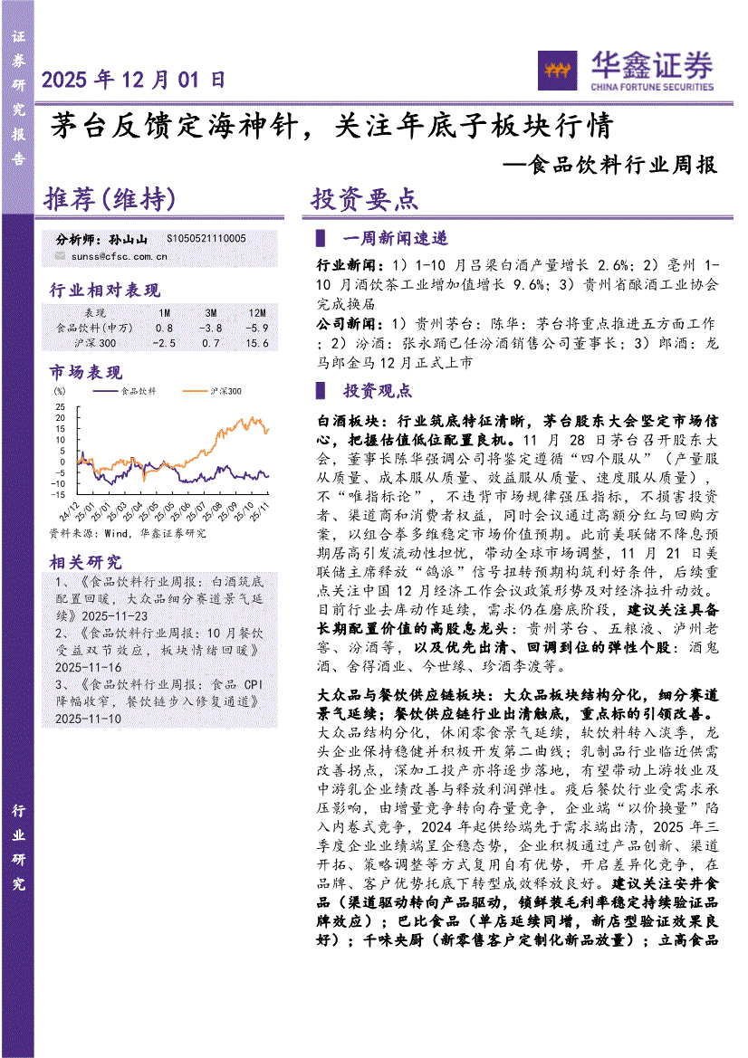 食品饮料行业:华鑫证券-食品饮料行业周报:茅台反馈定海神针,关注年底子板块行情-251201