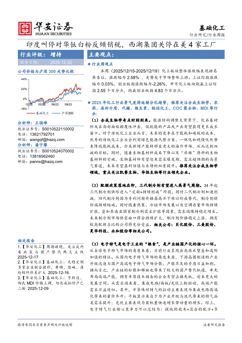 基础化工行业:华安证券-基础化工行业周报:印度叫停对华钛白粉反倾销税,西湖集团关停在美4家工厂-251222