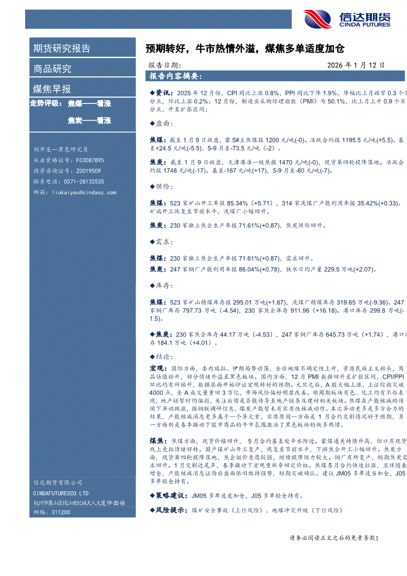 信达期货-煤焦早报:情绪发酵,焦企开启首轮提涨,煤焦多单适度加仓-260113