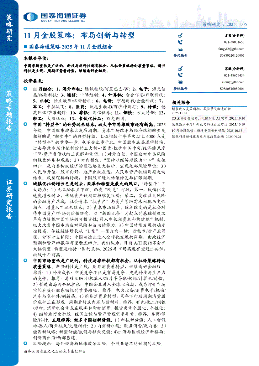 国泰海通证券-策略2025年11月金股组合:11月金股策略,布局创新与转型-251105