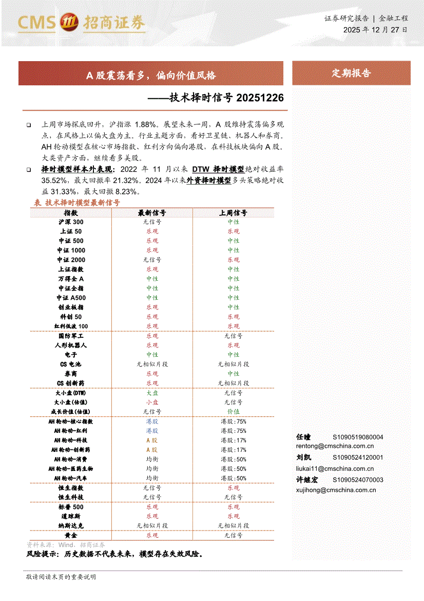 招商证券-技术择时信号:A股震荡看多,偏向价值风格-251227