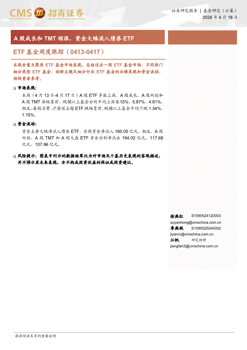 招商证券-ETF基金周度跟踪:A股成长和TMT领涨,资金大幅流入债券ETF-260418