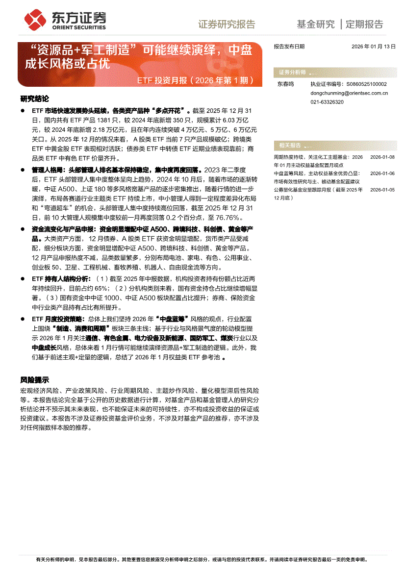 东方证券-ETF投资月报(2026年第1期):“资源品+军工制造”可能继续演绎,中盘成长风格或占优-260113