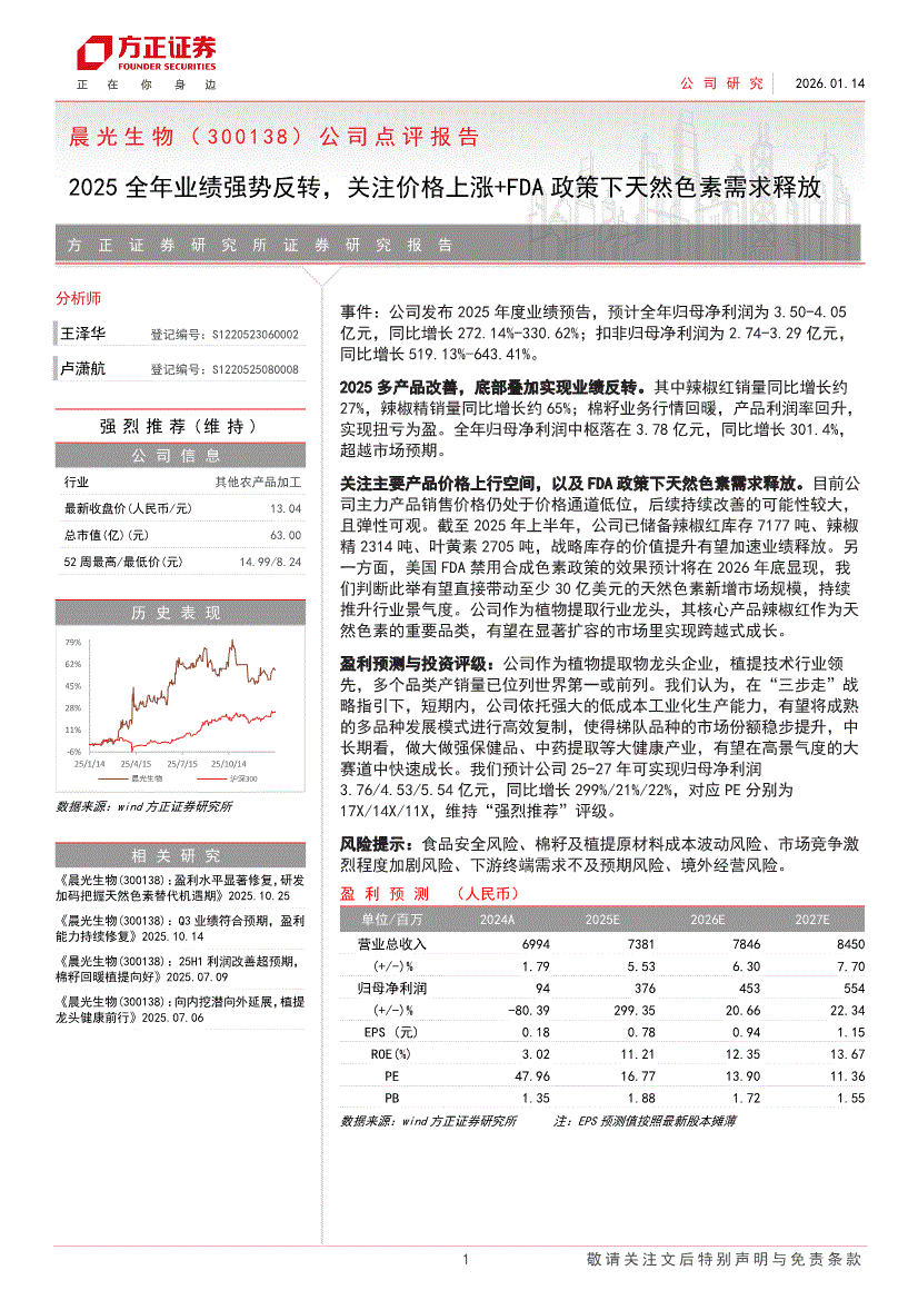 晨光生物:方正证券-晨光生物-300138-公司点评报告:2025全年业绩强势反转,关注价格上涨+FDA政策下天然色素需求释放-260114