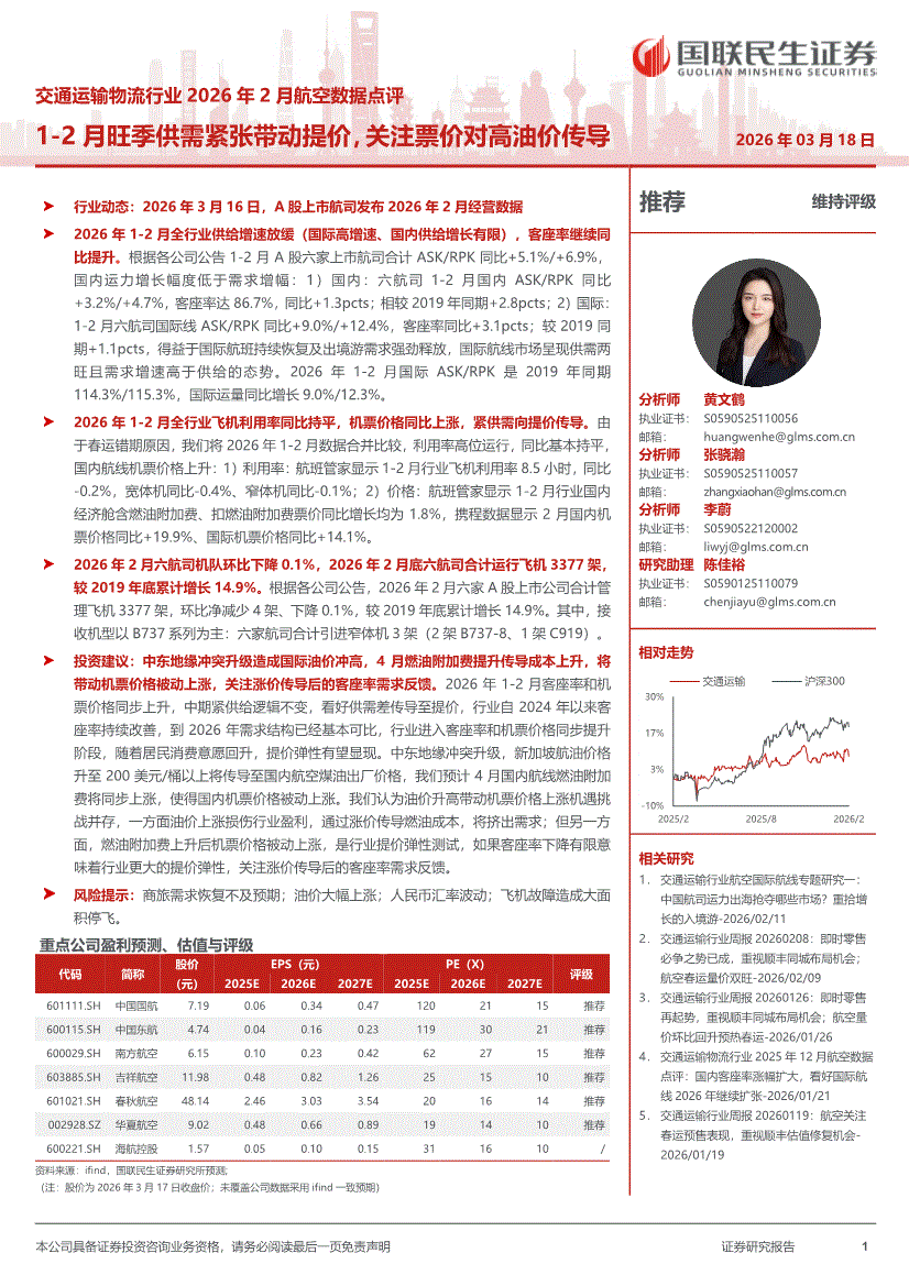 交通运输物流行业:国联民生证券-交通运输物流行业2026年2月航空数据点评:1~2月旺季供需紧张带动提价,关注票价对高油价传导-260318