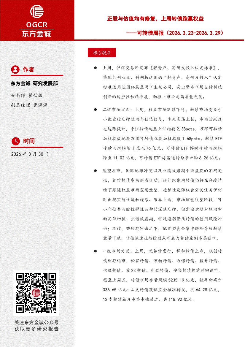 东方金诚-可转债周报:正股与估值均有修复,上周转债跑赢权益-260330