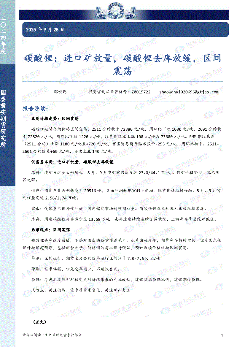 国泰君安期货-碳酸锂:进口矿放量,碳酸锂去库放缓,区间震荡-250928