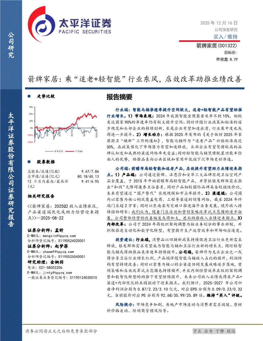 箭牌家居:太平洋证券-箭牌家居-001322-乘“适老+轻智能”行业东风,店效改革助推业绩改善-251216