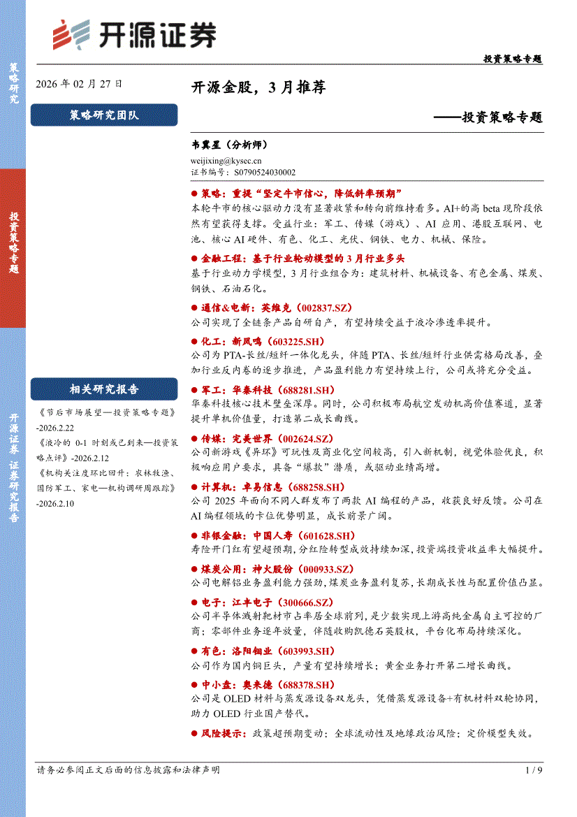 开源证券-投资策略专题:开源金股,3月推荐-260227