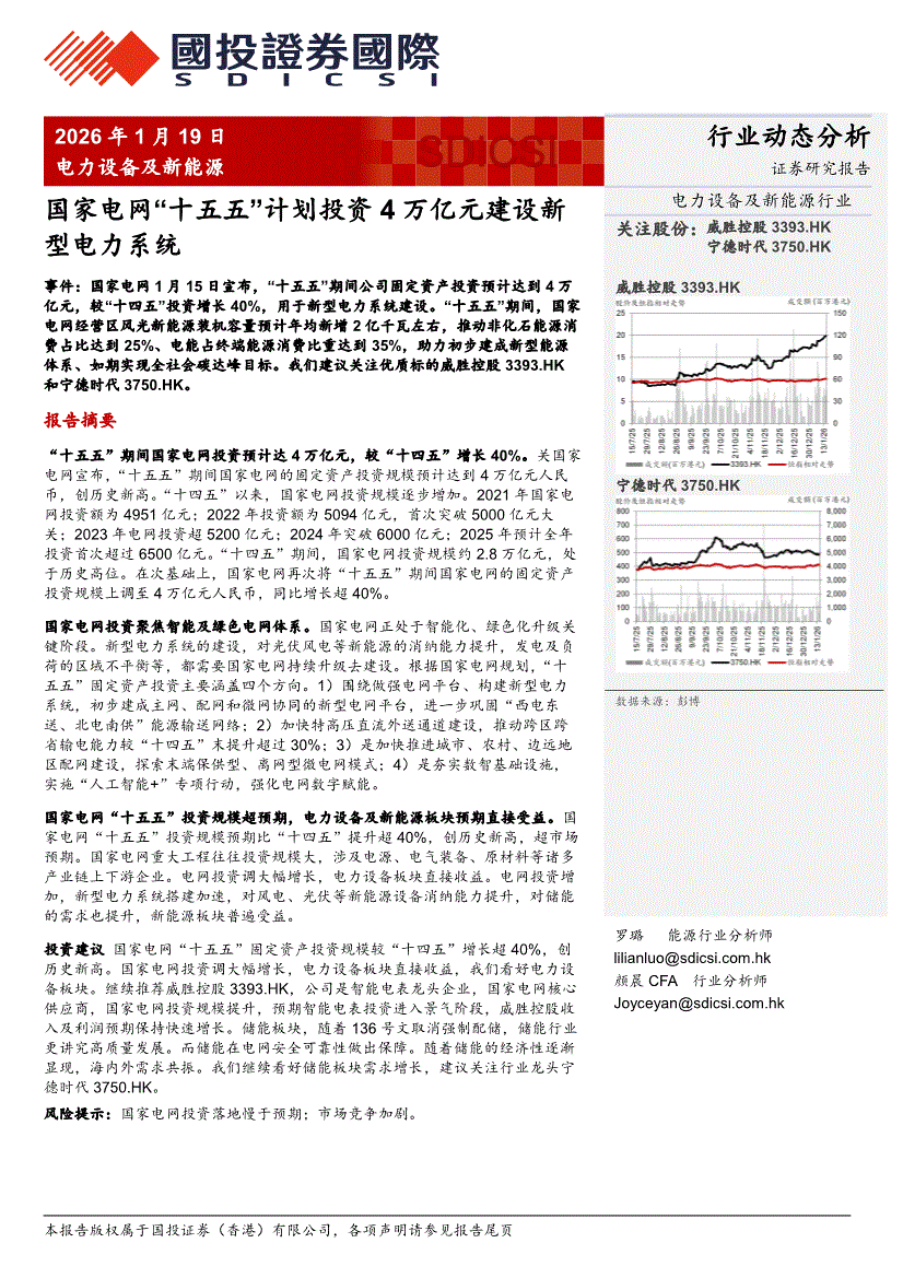 电力设备及新能源行业:国投证券国际-电力设备及新能源行业:国家电网“十五五”计划投资4万亿元建设新型电力系统-260119