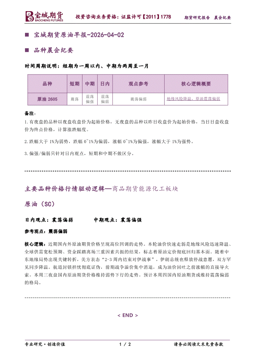 宝城期货-橡胶甲醇原油日报:地缘风险降温能化震荡偏弱-260331