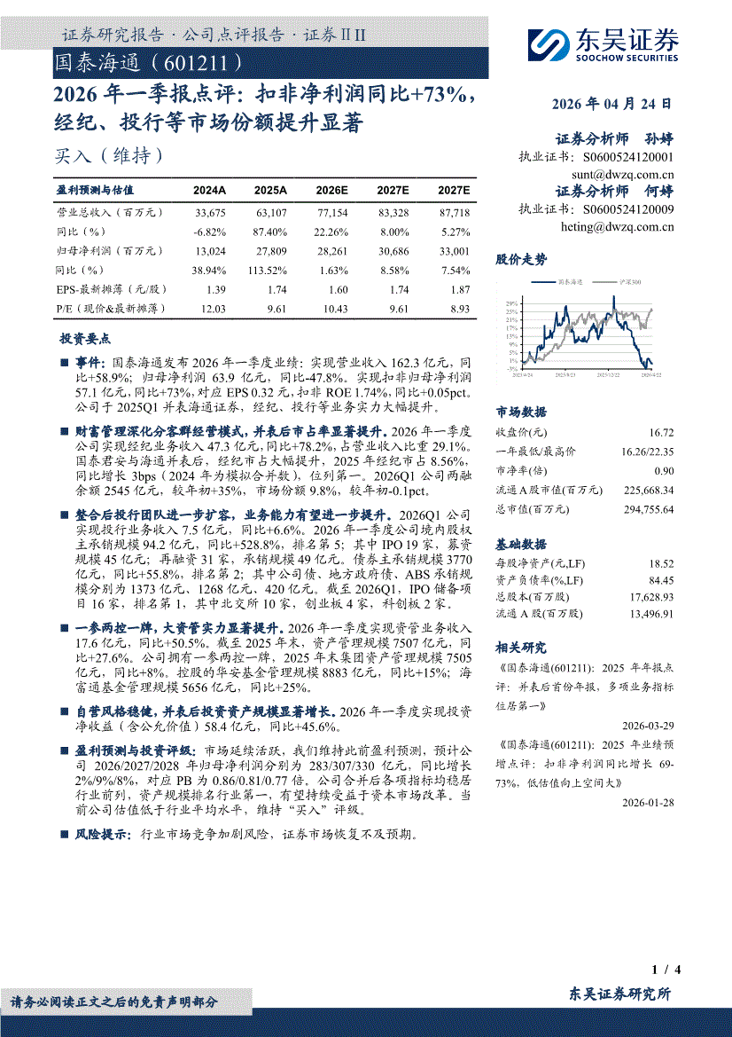 国泰海通:东吴证券-国泰海通-601211-2026年一季报点评:扣非净利润同比+73%,经纪、投行等市场份额提升显著-260424