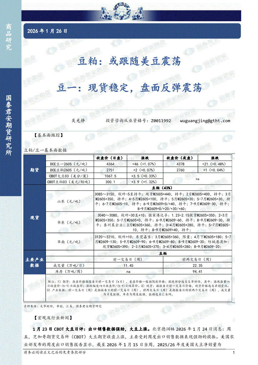 国泰君安期货-豆粕:或跟随美豆震荡,豆一,现货稳定,盘面反弹震荡-260126