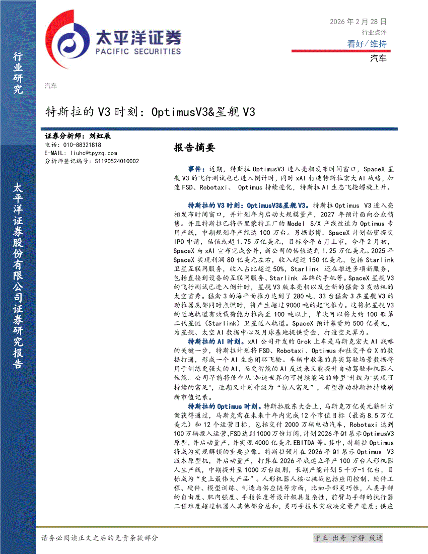 汽车行业:太平洋证券-汽车行业特斯拉的V3时刻:OptimusV3&星舰V3-260228