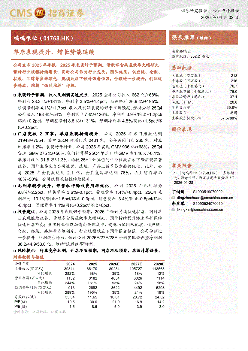 鸣鸣很忙:招商证券-鸣鸣很忙-1768.HK-单店表现提升,增长势能延续-260402