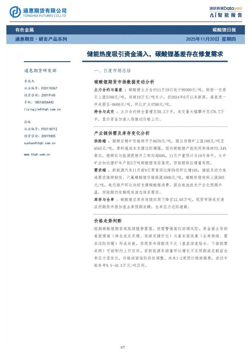 通惠期货-碳酸锂日报:储能热度吸引资金涌入,碳酸锂基差存在修复需求-251120