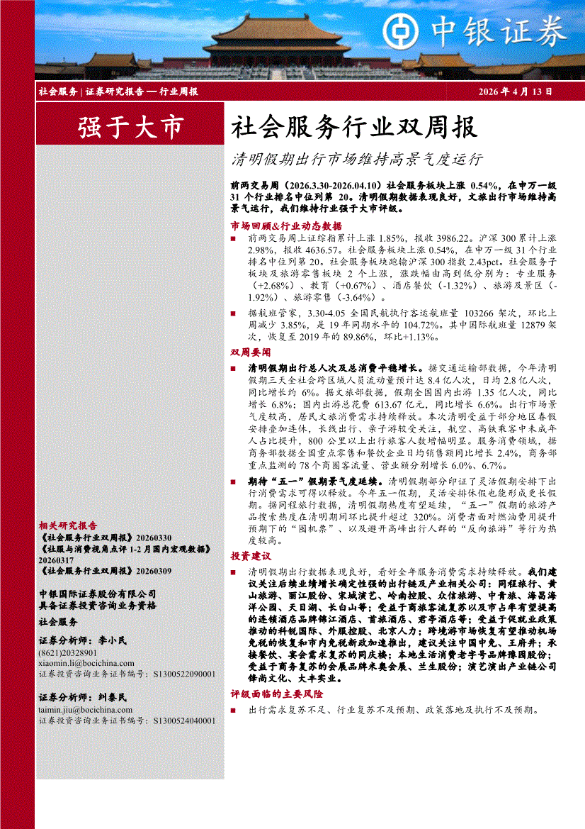 社会服务行业:中银国际-社会服务行业双周报:清明假期出行市场维持高景气度运行-260413