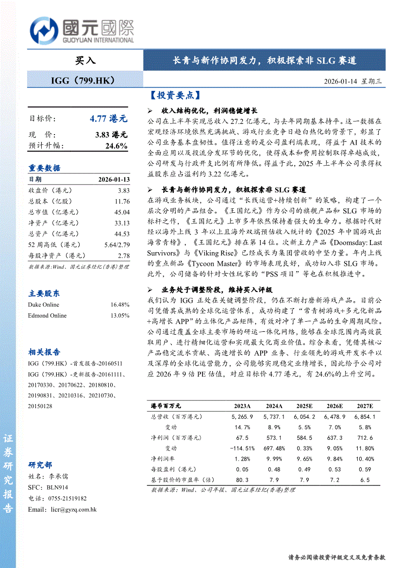 IGG:国元国际-IGG-0799.HK-长青与新作协同发力,积极探索非SLG赛道-260114