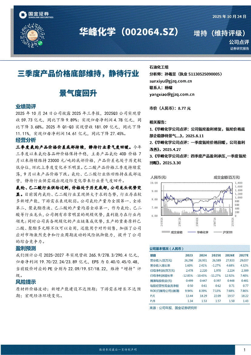 华峰化学:国金证券-华峰化学-002064-三季度产品价格底部维持,静待行业景气度回升-251024