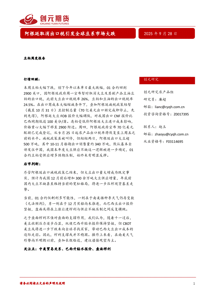 创元期货-豆粕周度报告:阿根廷取消出口税引发全球豆系市场大跌-250928