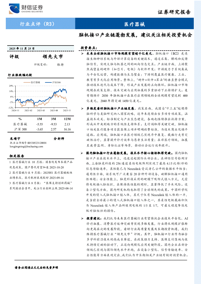 医疗器械行业:财信证券-医疗器械行业点评:脑机接口产业链蓬勃发展,建议关注相关投资机会-251125