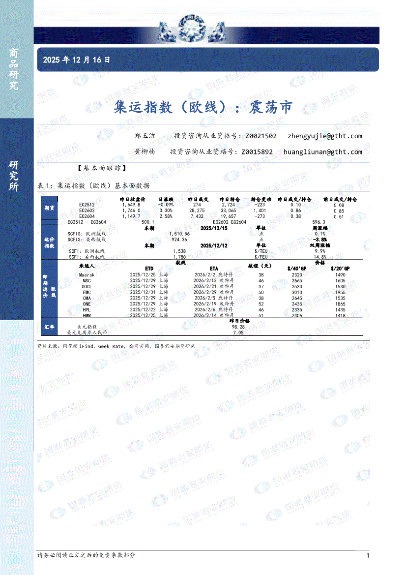 国泰君安期货-集运指数(欧线):短期情绪偏乐观,中期震荡市-251215