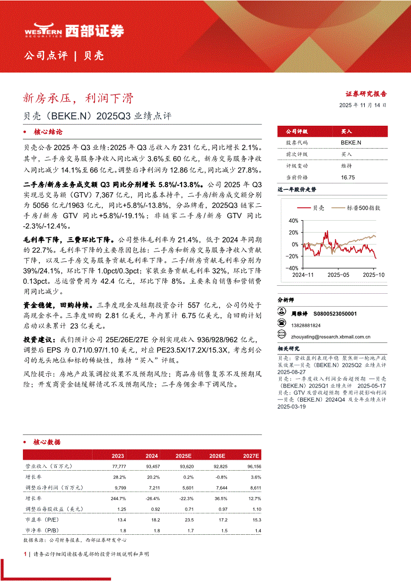 贝壳:西部证券-贝壳-BEKE.US-2025Q3业绩点评:新房承压,利润下滑-251114