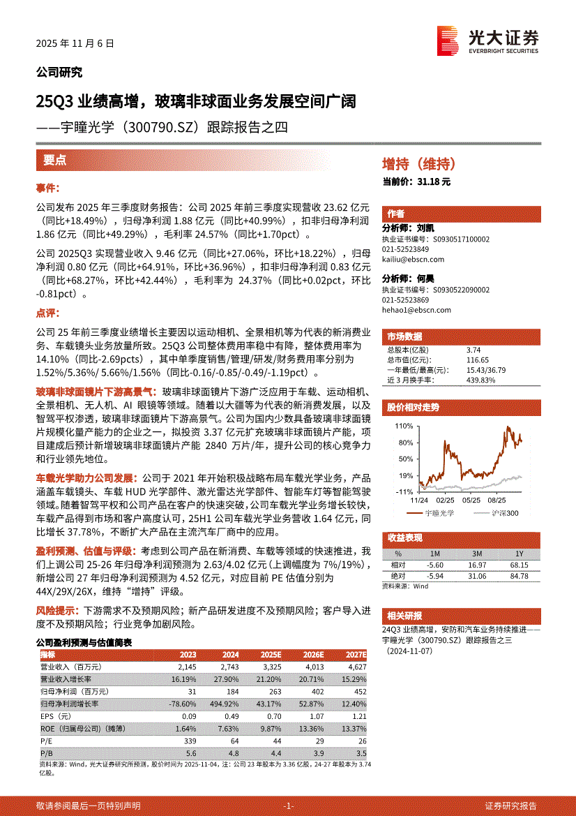 宇瞳光学:光大证券-宇瞳光学-300790-跟踪报告之四:25Q3业绩高增,玻璃非球面业务发展空间广阔-251106