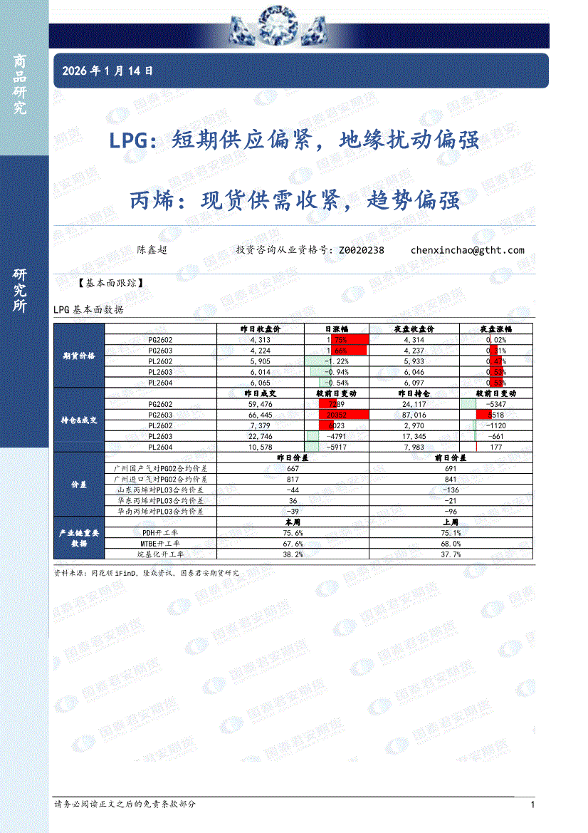 国泰君安期货-LPG:短期供应偏紧,地缘扰动偏强,丙烯,现货供需收紧,趋势偏强-260114