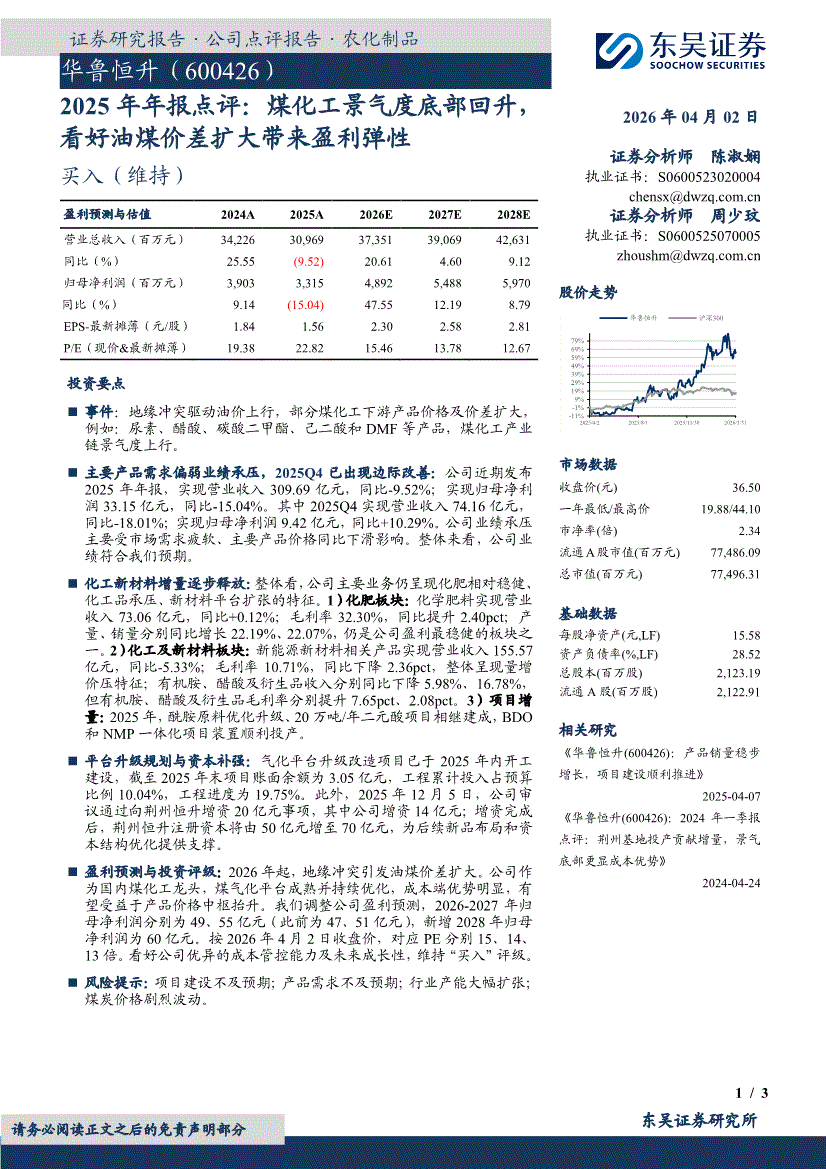 华鲁恒升:东吴证券-华鲁恒升-600426-2025年年报点评:煤化工景气度底部回升,看好油煤价差扩大带来盈利弹性-260402