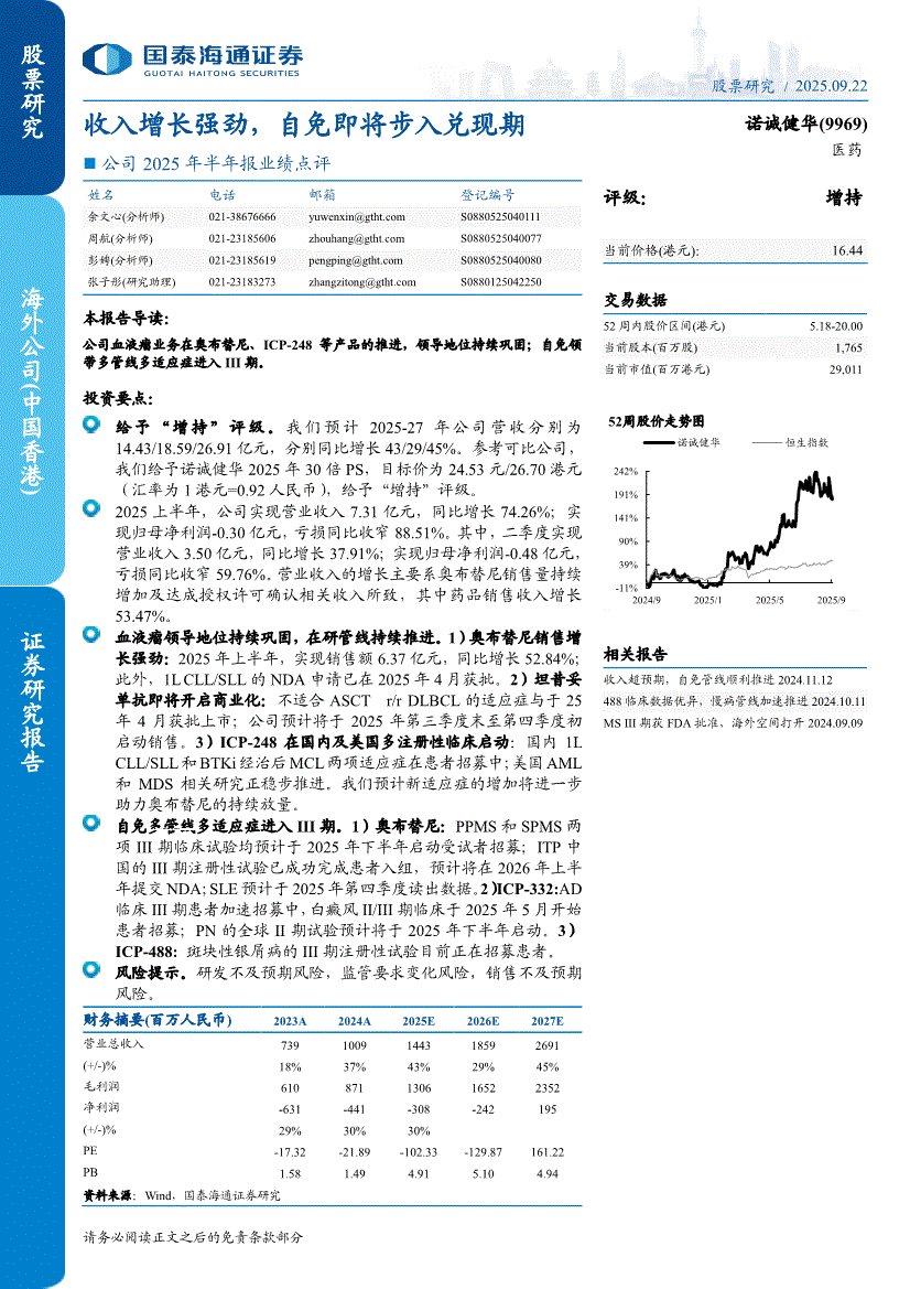 诺诚健华:国泰海通证券-诺诚健华-9969.HK-公司2025年半年报业绩点评:收入增长强劲,自免即将步入兑现期-250922