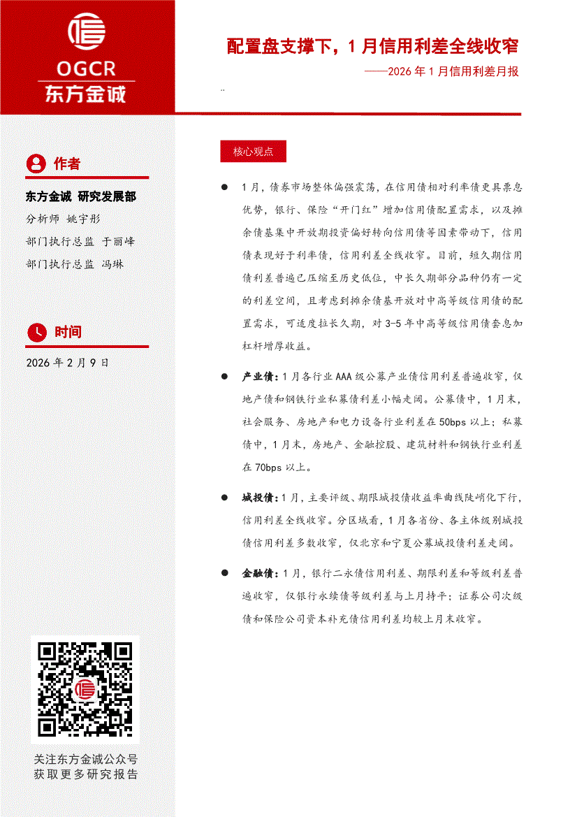 东方金诚-2026年1月信用利差月报:配置盘支撑下,1月信用利差全线收窄-260209