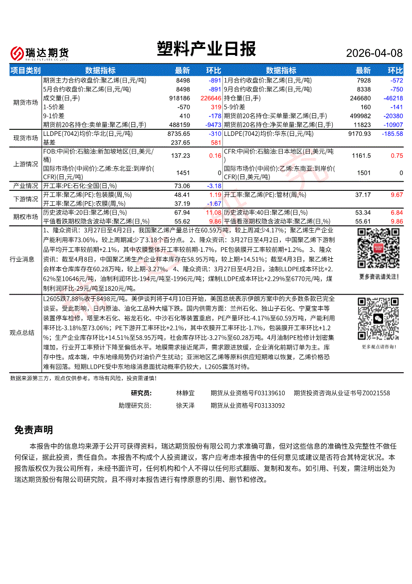 瑞达期货-塑料产业日报-260408