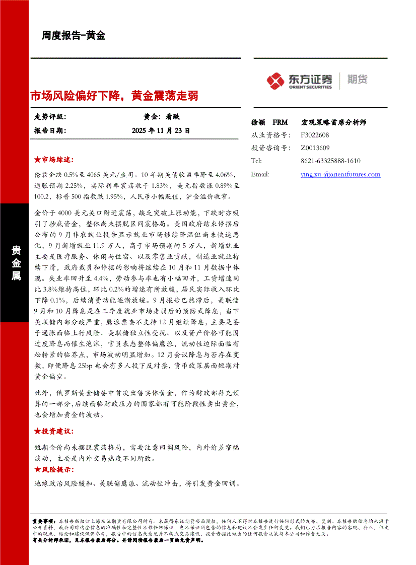 东证期货-黄金周度报告:市场风险偏好下降,黄金震荡走弱-251123