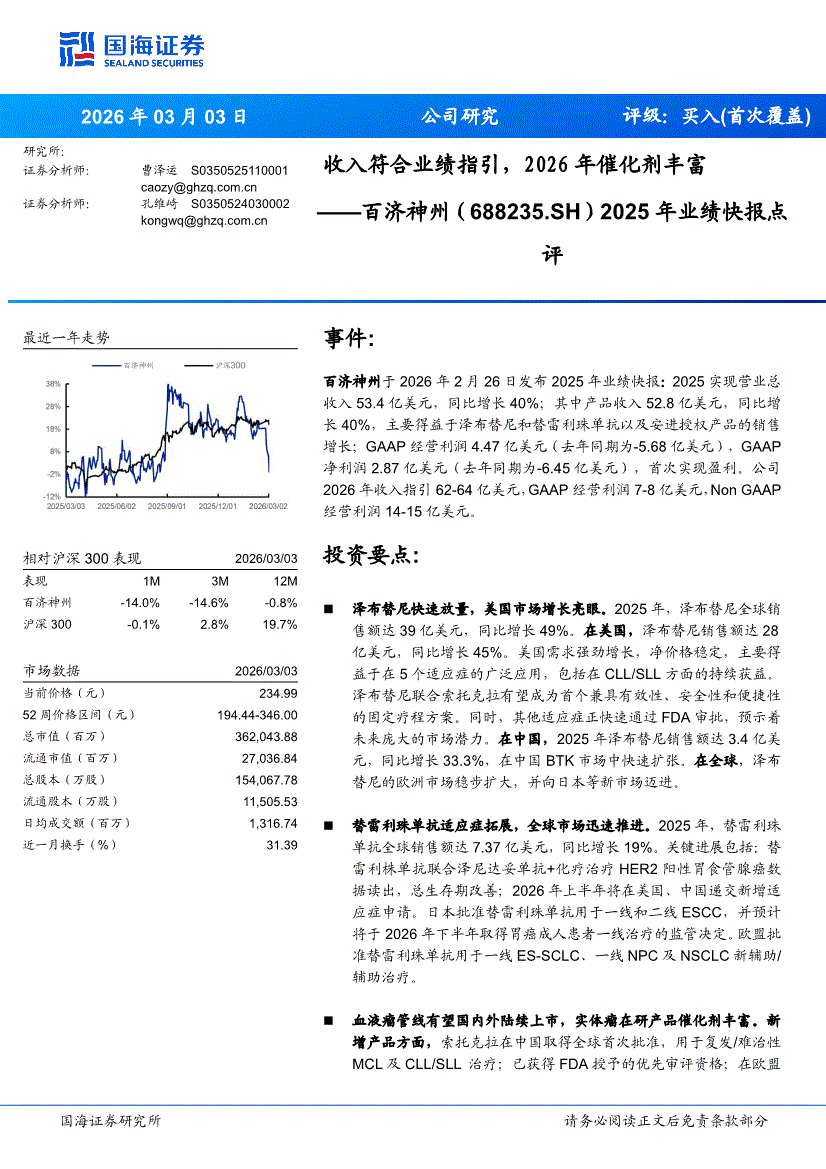 百济神州:国海证券-百济神州-688235-2025年业绩快报点评:收入符合业绩指引,2026年催化剂丰富-260303