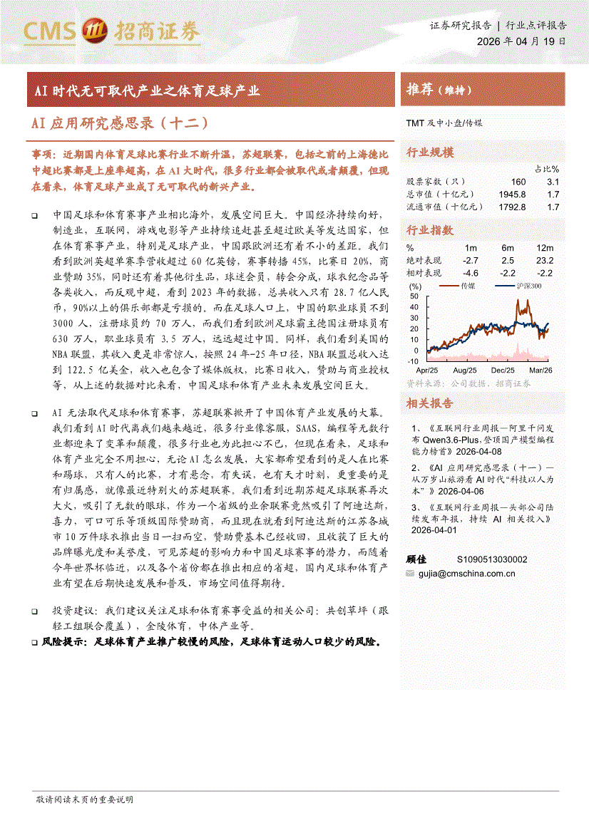 传媒行业:招商证券-传媒行业AI应用研究感思录(十二):AI时代无可取代产业之体育足球产业-260419