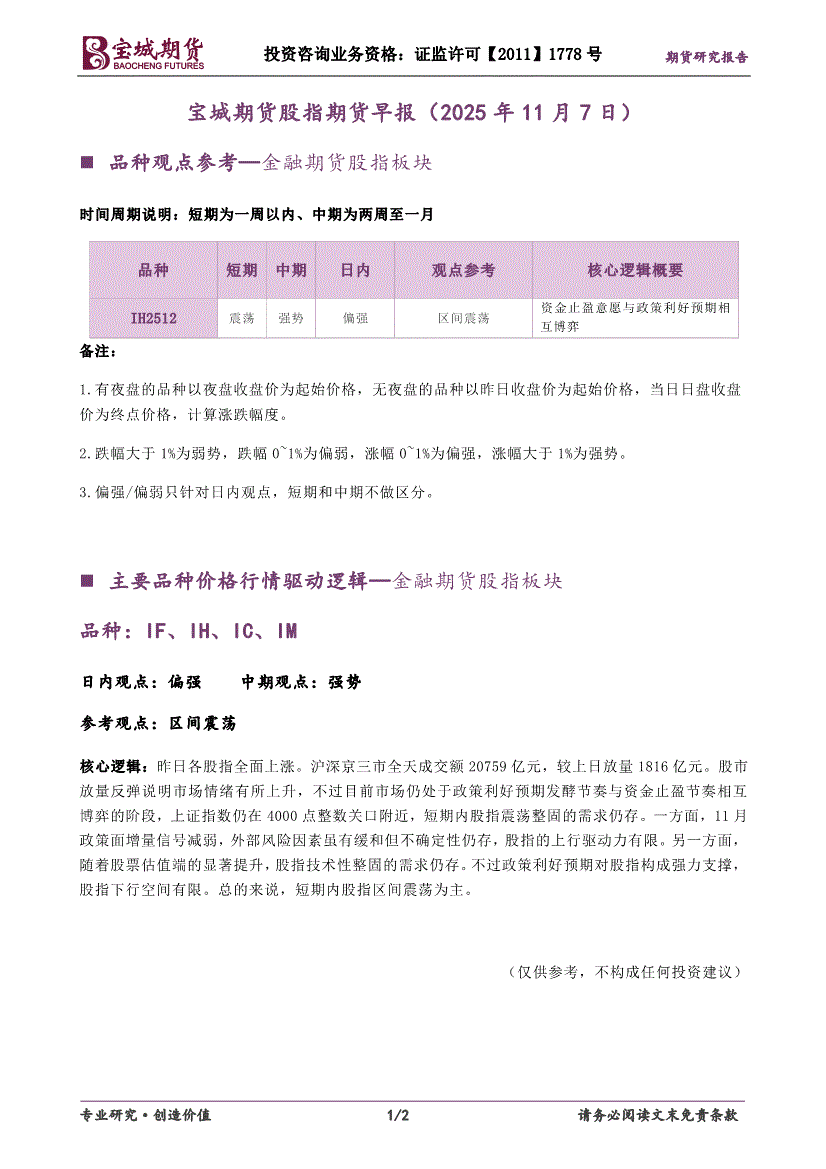 宝城期货-股指衍生品周报:短期内股指宽幅震荡为主-251103