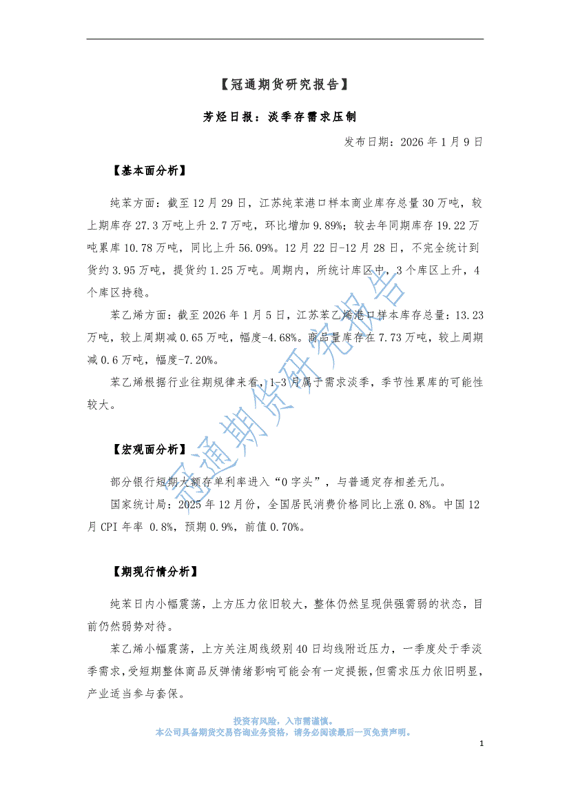 冠通期货-芳烃日报:苯乙烯超预期去库、纯苯历史级别高库存-260113