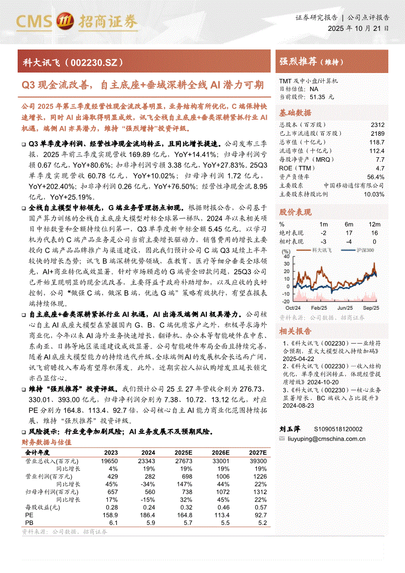 科大讯飞:招商证券-科大讯飞-002230-Q3现金流改善,自主底座+垂域深耕全线AI潜力可期-251021