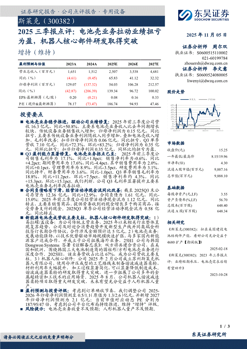 斯莱克:东吴证券-斯莱克-300382-2025三季报点评:电池壳业务拉动业绩扭亏为盈,机器人核心部件研发取得突破-251105