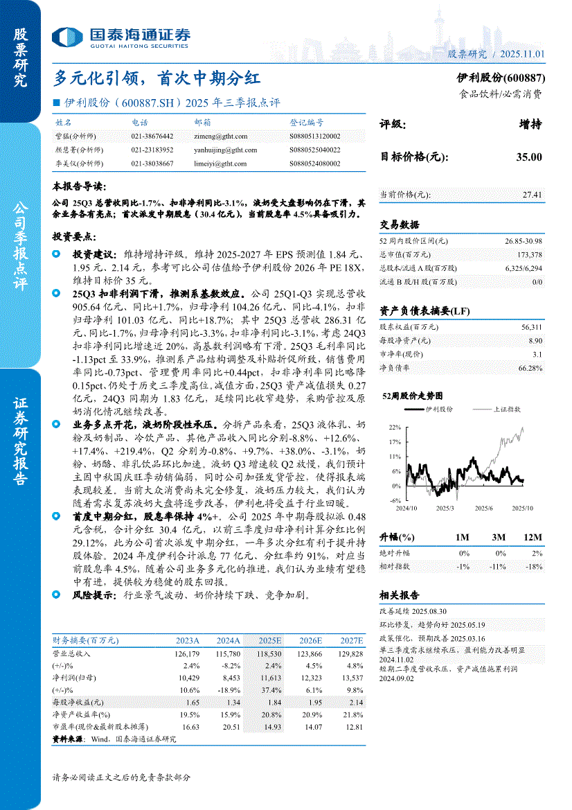 伊利股份:国泰海通证券-伊利股份-600887-2025年三季报点评:多元化引领,首次中期分红-251101