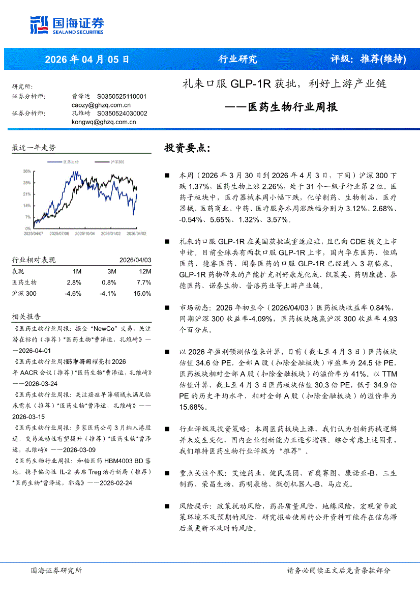 医药生物行业:国海证券-医药生物行业周报:礼来口服GLP~1R获批,利好上游产业链-260405