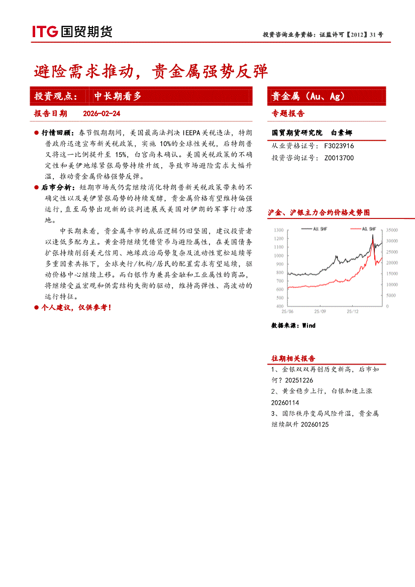 国贸期货-贵金属(Au、Ag)专题报告:避险需求推动,贵金属强势反弹-260224